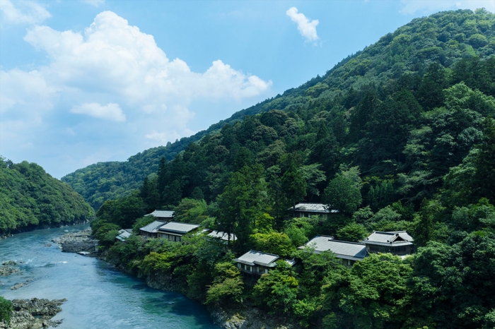 平安貴族が別邸を構えた京都府・嵐山。渡月橋から船に乗り、大堰川を遡ると現れる水辺の私邸。京都に息づく日本の伝統技法を感じる客室、五味を自在に表現する日本料理、四季の美しい景観と静けさの非日常の世界を楽しめるリゾートです。