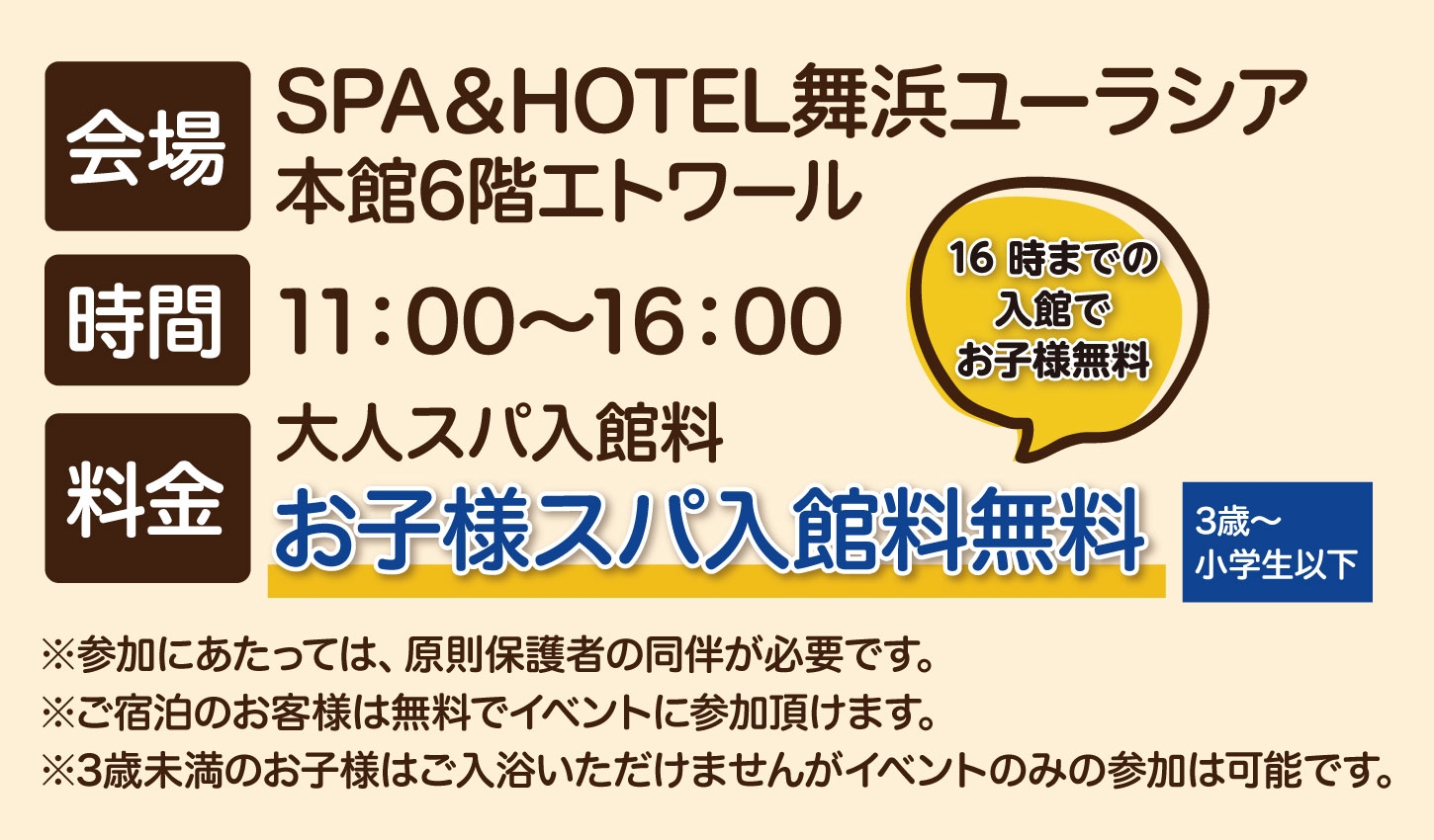 お子様と一緒にでんしゃ縁日やイベント限定オリジナル缶バッジ作りなど、様々なイベントをお楽しみいただけます。さらにご来場のお子様限定プレゼント企画、ホテル宿泊券が当たる抽選会イベントなど、わくわく楽しい、嬉しい企画を多数ご用意いたしました。当日は16時までの入館でお子様はスパ入館料が無料!