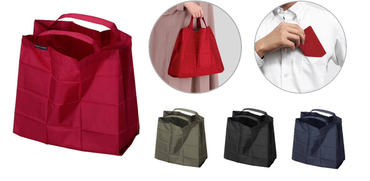 今回、私たちが提案するのは、グッドデザイン賞を受賞した「一瞬で広げられ、簡単に折り畳む」ハンカチ感覚のエコバッグです。生地には独自の15面プリーツ加工が施され、これまでエコバッグにとって課題であった「折り畳みの面倒くささ」を解消。折り目に沿って畳めば、カードサイズ程度の大きさへと簡単に収まり、シャツやズボンなどのポケットに気軽に入れて持ち歩くことができます。また、そんな見た目とは裏腹に機能性も充実。レジ袋と同じマチ設計で品物をしっかりホールドし、16リットルの大容量設計です。安心の抗菌・防臭加工生地使用で衛生面が心配な方にも安心のエコバッグとなっています。