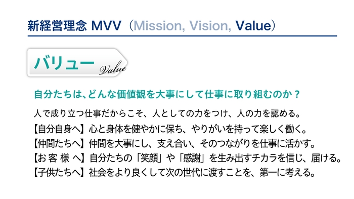 当社では、SDGsという言葉ができる以前から、「社会課題解決型企業」を標榜してきました。ここで言う「未来の子供」とは、「次世代」を意味する比喩であり、現在よりもより良い社会を次世代に残していくという当社の決意そのものを示す表現です。これまでも「大義」として「すべては未来の子どもたちのために」という文言を使用してきましたが、今回のMVV策定の議論の中でも「未来の子ども」という言葉への従業員の理解や共感は非常に高く、今後もタグラインとして使用していきます。