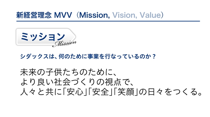シダックス株式会社は、社内外の経営環境や事業ポートフォリオが大きく変化する中、今後もRe-Growth(再成長)を遂げていくためにグループ従業員が共通して目指すべき新たな旗印として、2022年度より、経営理念体系「ミッション(Mission)、ビジョン(Vision)、バリュー(Value)」(以下:MVV)を新たに制定しました。