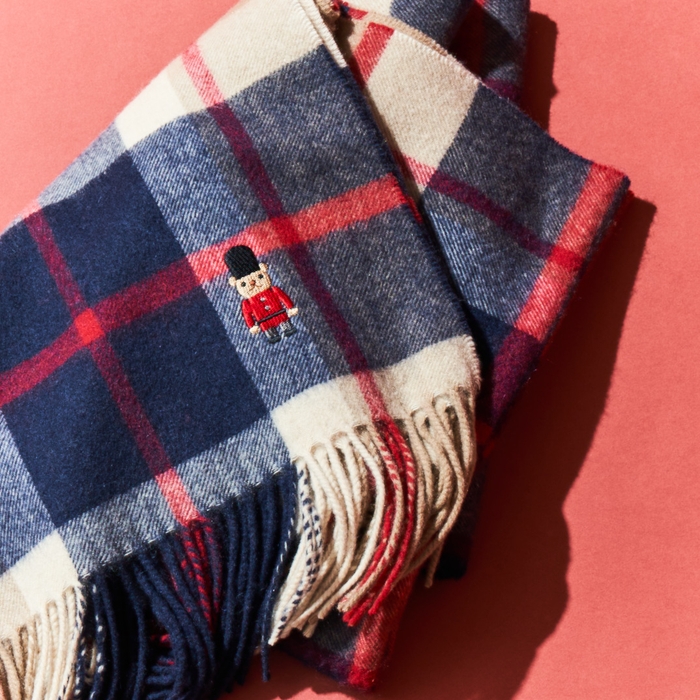 ベーシックな無地にバッキンガム宮殿を衛る熊の衛兵「バッキンガムベア」をアクセントづかいしたマフラー。