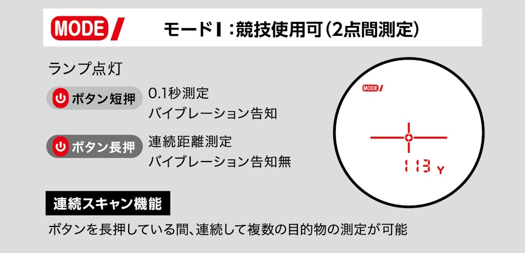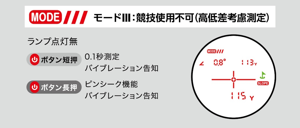 Mボタンを押すと、「モードI(競技使用可)」「モードII(競技使用可)」「モードIII(競技使用不可)」「明るさ調整モード」の順番で切替わります。