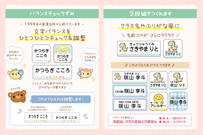 『毎日のお仕事や育児に追われている、パパ・ママのお手伝いが少しでもできれば…』という想いで、22年にわたり、お名前シールをはじめ名入れ商品の販売を通じて、仕事や育児に多忙な保護者のみなさまの入園・入学準備のお手伝いをしてまいりました。これからもさまざまなアイデアを発信し、名前つけをラクに楽しく、使う人々が笑顔になるアイテムを作り続けてまいります。