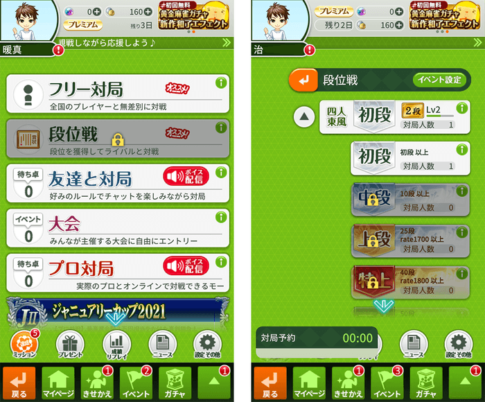 プレイヤーの段位に応じたロビーに分かれることにより、実力の近いプレイヤーと適切なロビーで対局することができます。