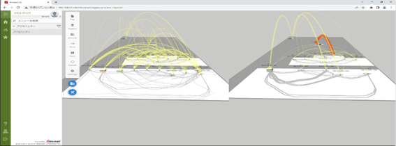 また、この3次元可視化技術は、業務の実行プロセスを比較することができる機能が備わっているため、同じ視点から月初、月末の比較をすることや、業務改善前後における変化を確認することができます。これによって、システムの改修効果を確認できるだけではなく、さまざまな業務の進め方に応じたシステム利用の違いも確認することができます。