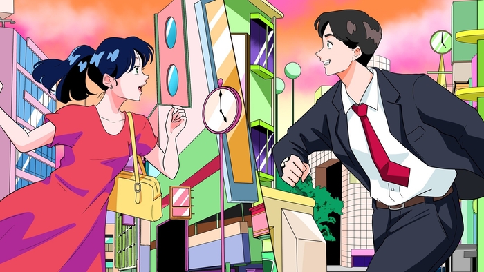 イラストはchao!による描きおろし。夕焼けに染まる渋谷の街を背景に、駆け寄るように顔を見合わせるふたりの男女を描写。90年代の恋愛ドラマを思わせるポージングと、ポップなビル群、レトロフューチャー風の時計塔など、“Newtro”ならではの街並みが楽曲の世界観とリンク。恋の高揚感と期待感が詰まった、視覚的にも“ラブストーリーの1ページ”を感じさせる作品となっています。
