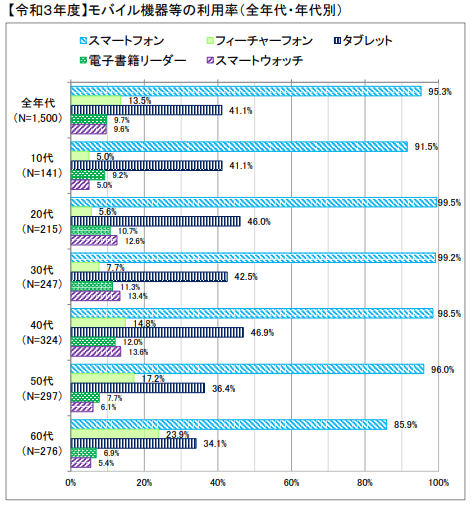 総務省の情報通信メディアの利用時間と情報行動に関する調査報告書によると、スマホを使用している割合は10代で91.5%と、9割以上の方がスマホを使用してインターネットを閲覧しているということになります。