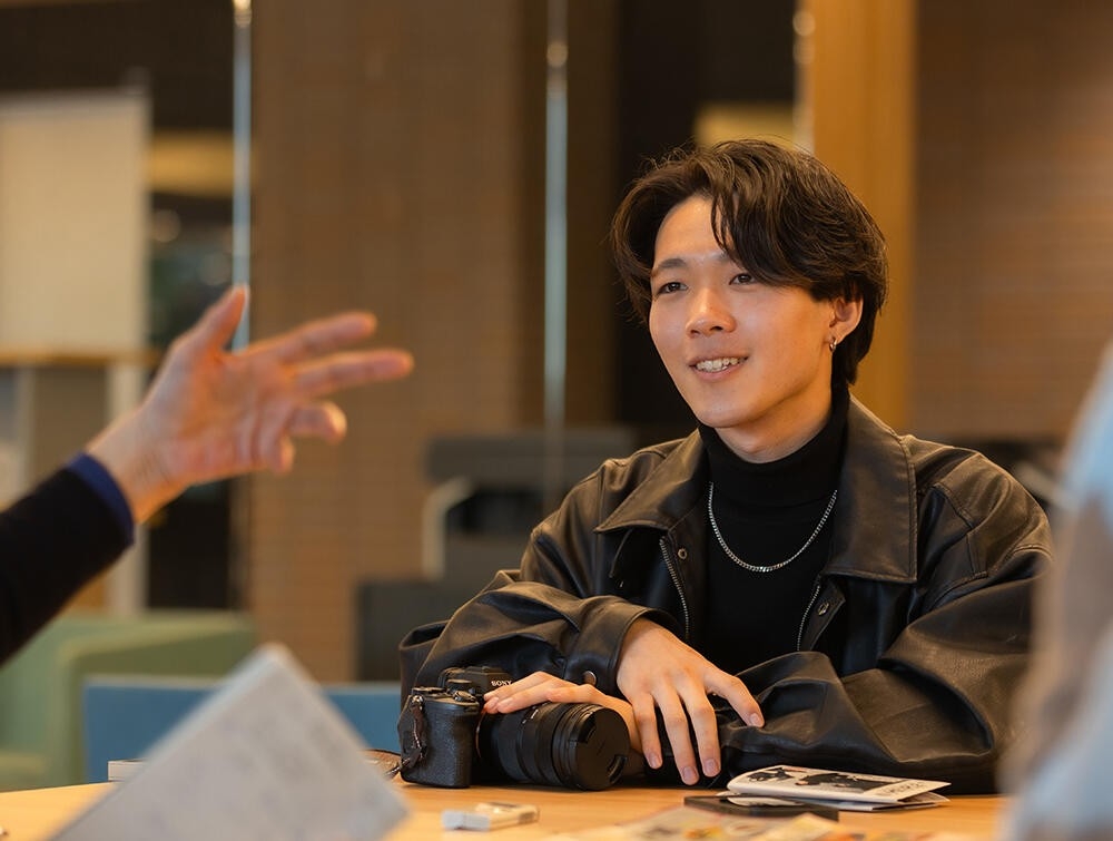 学内で配布されている情報紙「MEIPLE」でファッションスナップを担当したのは写真部の部員たち。2024年、この写真部に凄腕の新入生、神藤康太郎さんが入部した。