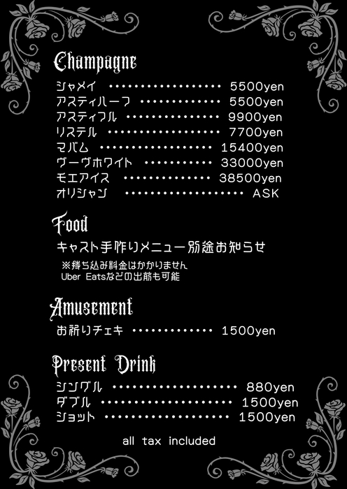 また、オムライスやミックスナッツなどの軽食やおつまみをご用意している場合もございます。料理好きのキャストがいる日には、特別な料理も提供されることがあります。