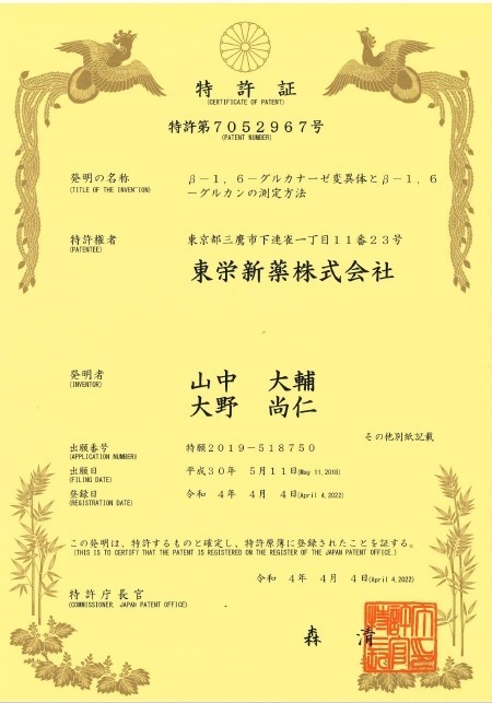 本特許は、東京薬科大学薬学部免疫学教室と共同で行った、当社の露地栽培アガリクスKA21株に関する共同研究の中から発案された技術です。関連する技術として、2021年10月26日に登録された特許「β-グルカン結合タンパク質、β-グルカン検出キット、人工DNAおよび細菌(特許第6966756号)」、2020年9月7日に特許出願した「β-1,6-分岐β-1,3-グルカンまたはβ-1,3-グルカンの検出・定量方法および検出・定量キット(特願2020-149797)」があります。(どちらも特許権者は当社 東栄新薬株式会社)