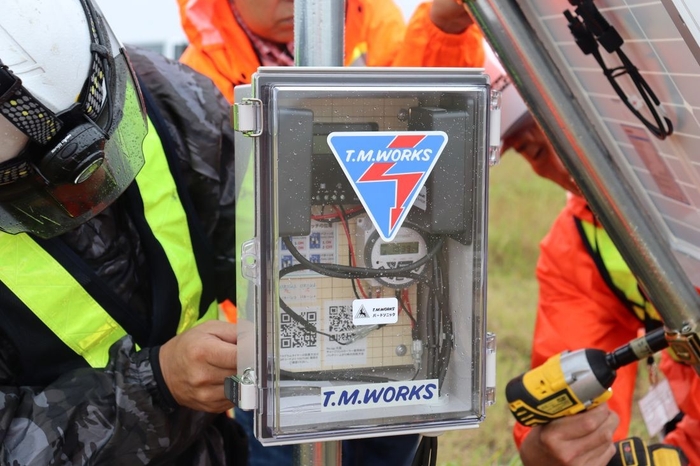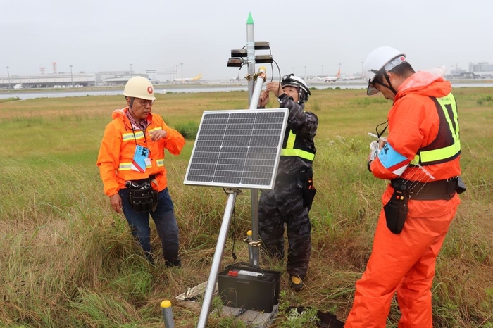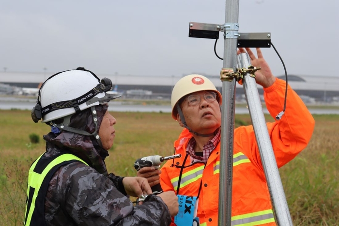 関空では6月3日、あいにくの雨模様の中、辻特担教授とT.M.WORKSの轟秀明社長と渡邊孝夫さんが、関西エアポート株式会社のスタッフに見守られながら、A滑走路(長さ3,500m)東側の緑地帯に打ち込まれた計14本のポールに、バードソニックのスピーカー、太陽電池パネル、バッテリーなどを次々に取り付けていきました。