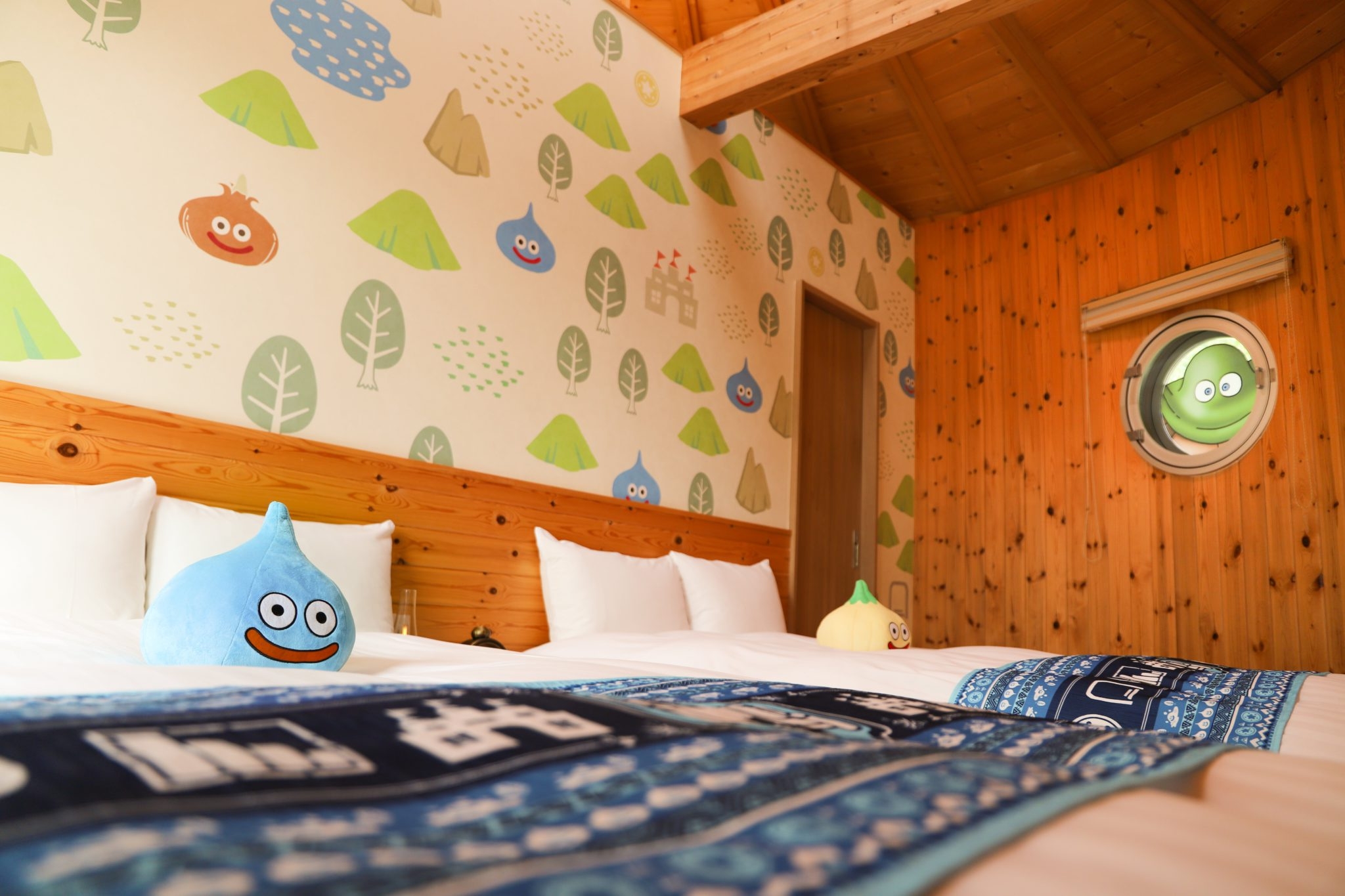 「ドラゴンクエスト」の世界観を再現したドラゴンクエストコラボルーム『スライムのコクーン』では、同作品に登場するモンスター「スライム」をはじめ、「ドラゴンクエスト アイランド」のオリジナルキャラクター「ホミロット」、モンスター「たまねぎスライム」など、多数のキャラクター装飾が壁や窓など部屋全体に施されているほか、オリジナルのスライム型のペンダントライトや宝箱を設置するなど、遊び心が溢れる仕掛けが満載です。