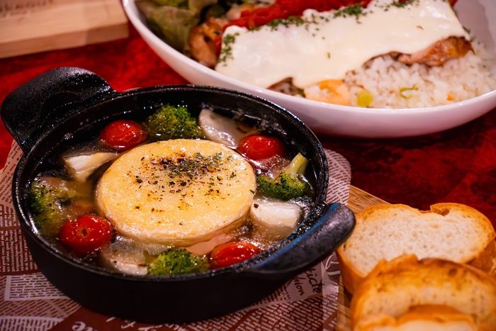 お料理は鴨スモークの生ハムやモッツァレラチーズの生ハム巻きなどの前菜4種、カマンベールアヒージョ、チキンオーバーライス風の飯物、さらにデザートなど、盛りだくさんのメニューです。