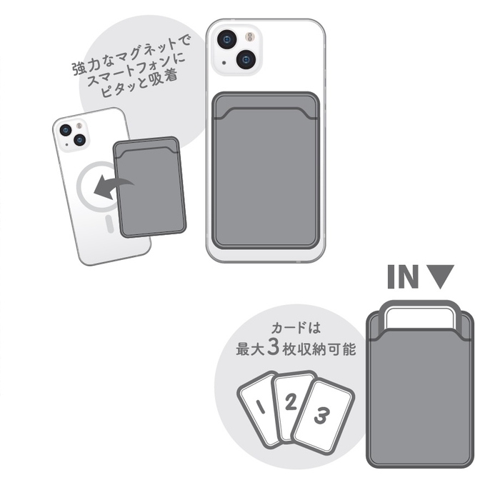 上品で手触りのいいPUレザーを使用。強力なマグネットでMagSafe対応したiPhoneの背面にピタッと吸着します。カードは最大3枚まで収納が可能です。