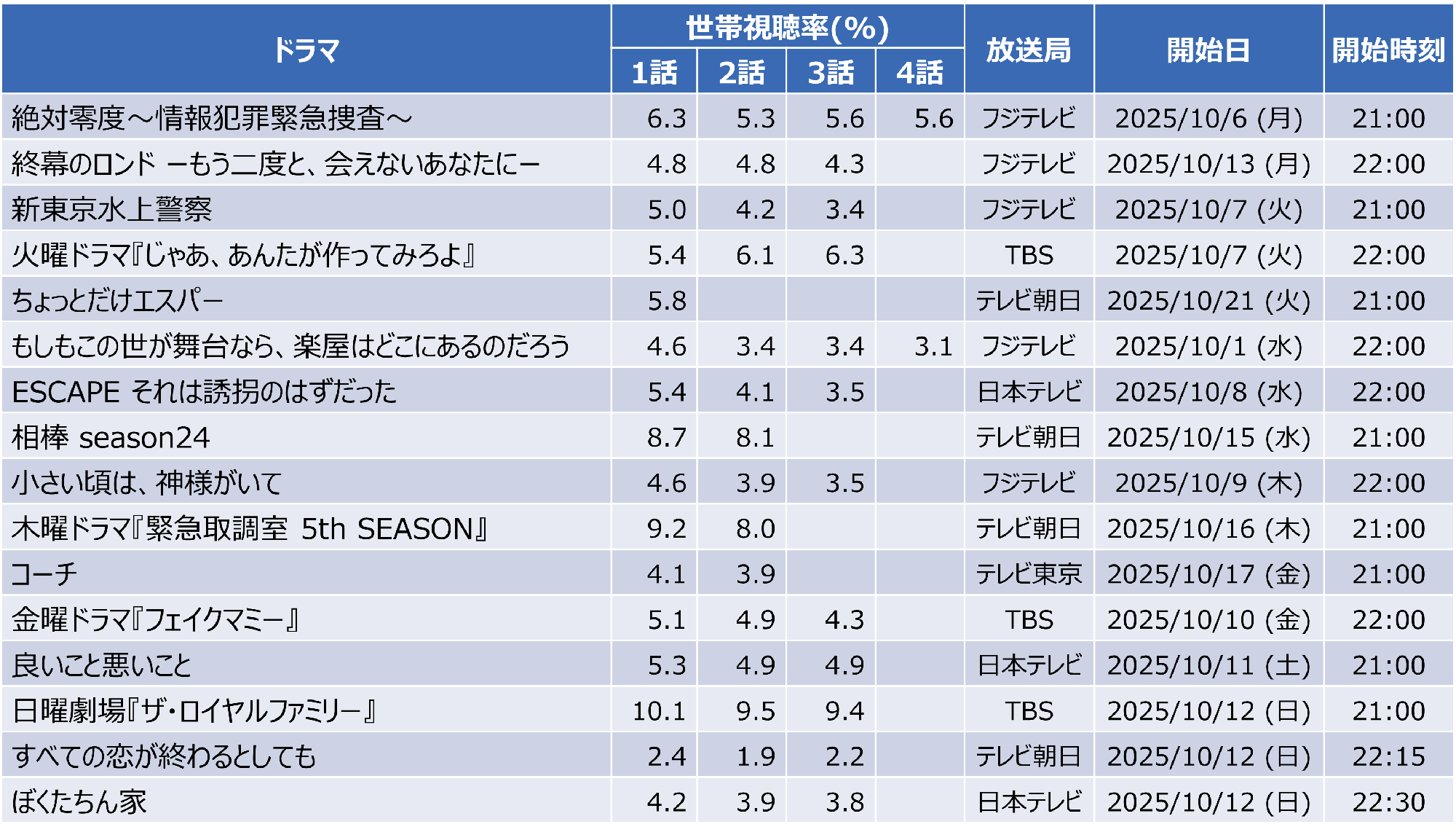 まずは、2025年秋ドラマの初回から第4話までの世帯視聴率を放送回ごとに見ていきましょう。以下の表は、16作品の各話視聴率をまとめたものです。