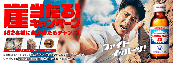 リポビタンポイントチャージステーションでポイントを貯めると、往年のCMシリーズの舞台である「崖」にちなんだ豪華景品が182名様に当たります。