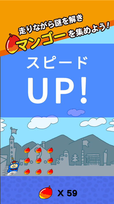 ステージ上には「謎」が仕掛けられたパズルがあり、ジャンプで避けるか、あえて当たって挑戦するかはあなた次第。謎に正解すればボーナスマンゴーをゲット。不正解だとその場でゲームオーバーに。一気に高得点を狙うか、安全に地道に稼ぐか、自由なプレイスタイルでお楽しみいただけます。