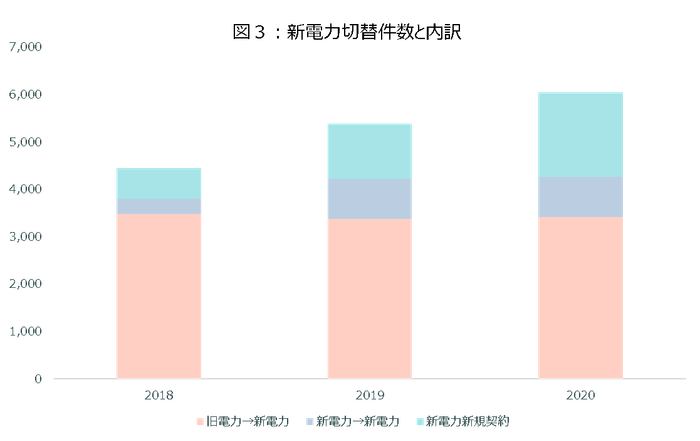 新電力への切替件数で見ても、2018年時点で年間約445万件でしたが、2020年では年間約600万件にまで年々増加しております。特に引越し等による再点を含む新規契約件数は2018年の約65万件から2020年は約180万件と大きく伸長しております(図3)。