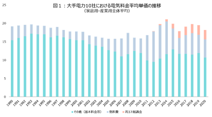 再エネ賦課金は年々増額傾向にあり、2012年には1kWhあたり0.22円だったのが、2021年現在では3.36円(※2)に上昇しております。また燃料費の高騰も相まって、結果として、平均的な電気料金は2010年と比較し2020年は15%増加しております(図1)。