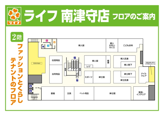 2階「ファッションとくらしのフロア」も品ぞろえを充実させ、一度のお買い物で食料品・日用品・衣料品がそろうワンストップショッピングを実現いたします。