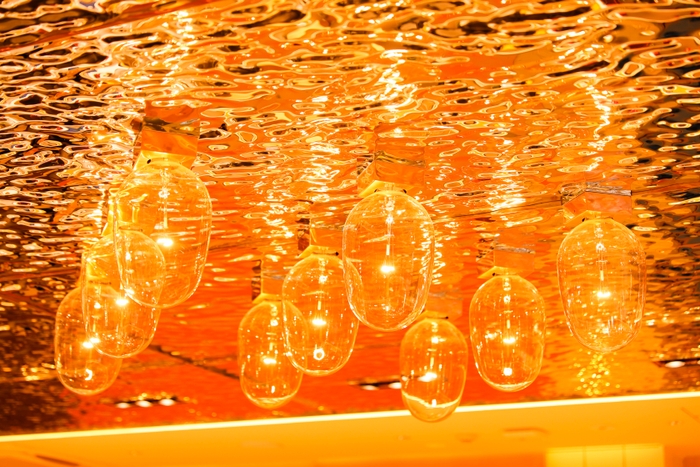 夕陽をイメージした橙の壁に、きらきらと輝く波をイメージした「波板仕上げ」の天井。夜の漁船が吊るす漁火をイメージした照明が店内を照らし、温かみの中にも活気を感じさせる雰囲気となっております。誰もが親しみやすい回転寿司のスタイルで、熟練の本物をお楽しみいただける当店。「鮨 銀座おのでら」総本店料理長・坂上 暁史による徹底監修のもと、ひと手間の仕事を惜しまない江戸前鮨を、よりお手頃な価格でご提供いたします。