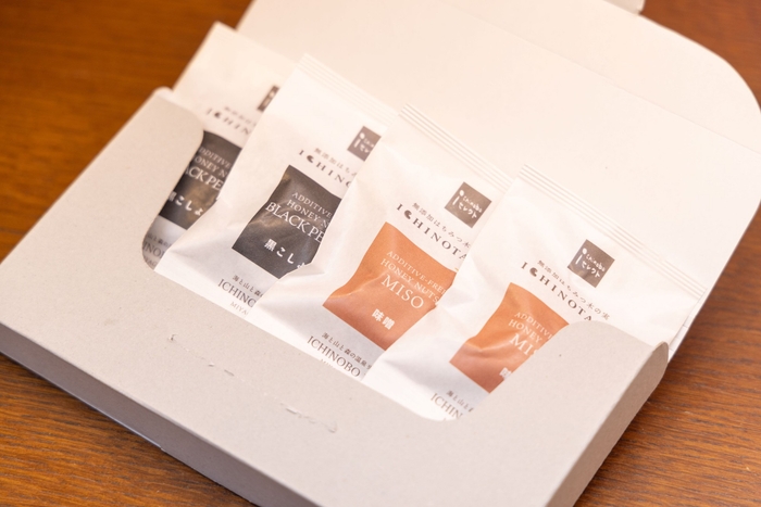 はちみつ&黒豆きなこの「ヘルシーおやつセット」と、黒こしょう&味噌の「甘辛おつまみセット」の2種類が販売開始。