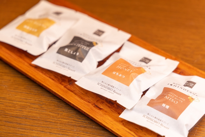 ホテルラウンジのおやつとしても人気のはちみつと黒こしょうの他に、今回の新発売にあわせて、黒豆きなこと味噌が新たに仲間入り。