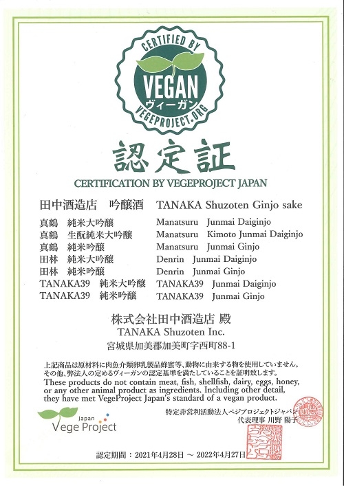 1789年(寛政元年)創業の宮城県・加美町の蔵元「田中酒造店」が 4月28日に日本酒のヴィーガン認証を取得!