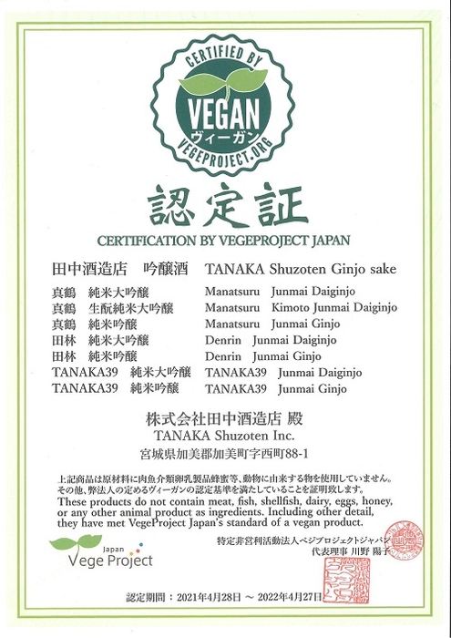ヴィーガンとは、肉や魚はもちろん卵や乳製品を含む、動物性食品を一切口にしない「完全菜食主義者」のことです。日本酒は米と水を原材料としていることから、認定を取得したことで世界中のヴィーガンの方にその存在を知っていただく機会になればと考えます。