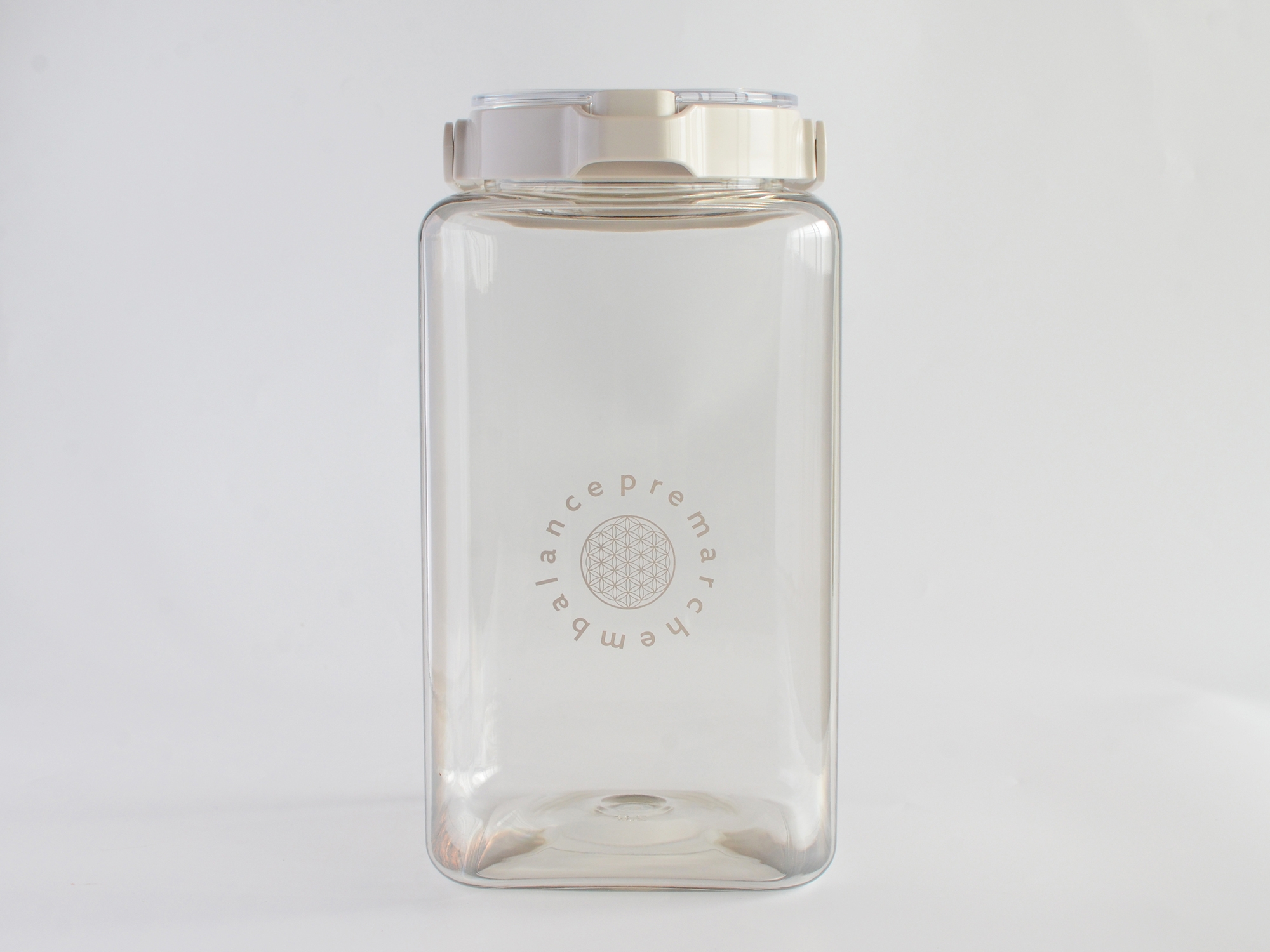 エンバランス加工を施した容器の前面に生命エネルギーのシンボル「フラワーオブライフ」のマークをプリントしました。フラワーオブライフは宇宙の有象無象や生命の根源を表す幾何学模様で、強いエネルギーを持つとされています。