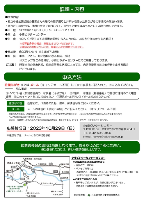 メールの件名に「芋洗い体験」とご記入ください。(キャリアメール不可)