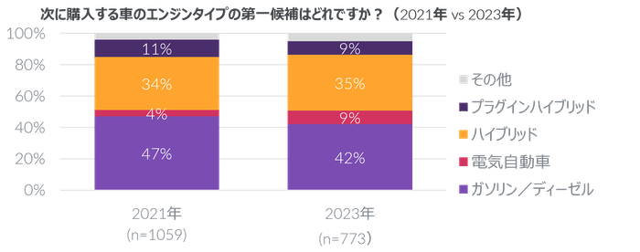 今後4年以内の新車購入意向者を対象に行った調査(2023年4月実施)にて、次に購入する車のエンジンタイプの第1候補として「電気自動車」を検討すると回答した人は9%で、2021年に行った同調査の4%から上昇した。