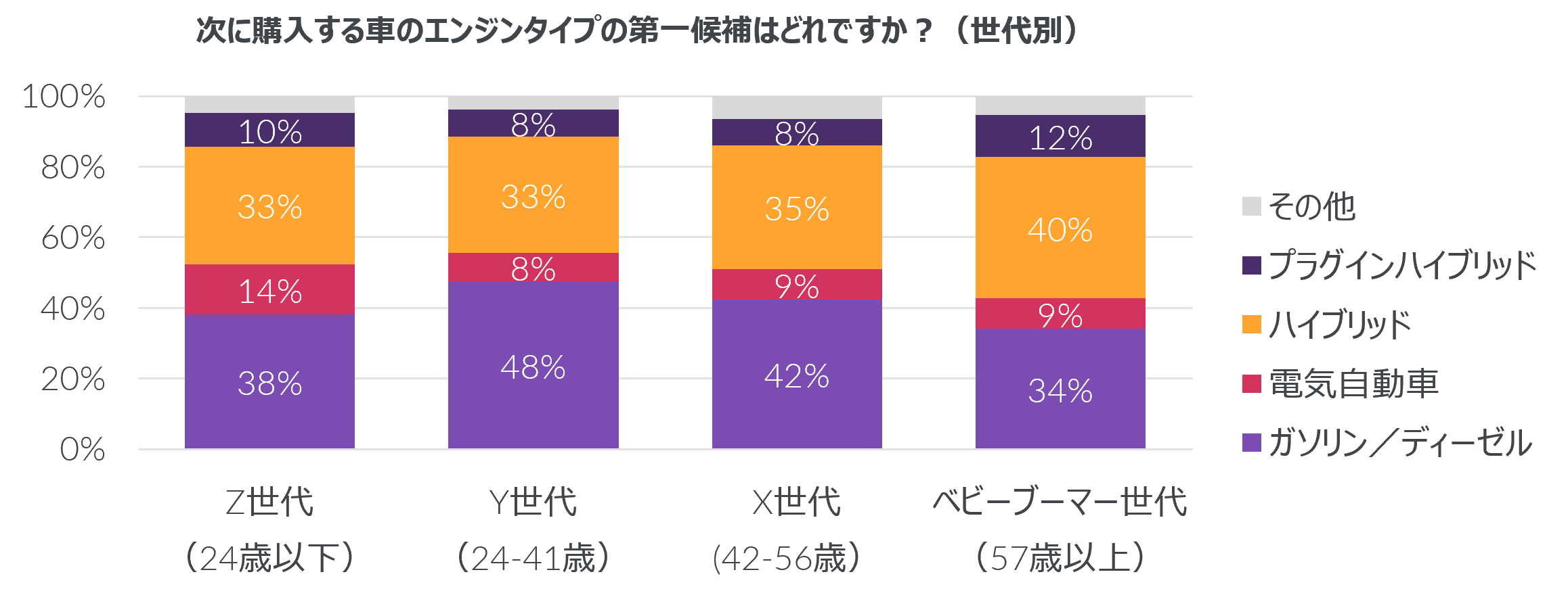 世代別に見ると、Z世代と呼ばれる24歳以下において電気自動車を検討する人は14%で上の世代よりも高い傾向が見られた。しかし、電気自動車だけでなく、ハイブリッド、プラグインハイブリッドも含む代替パワートレイン車全体の意向率は、57歳以上のベビーブーマー世代の61%と最も高い結果であった。