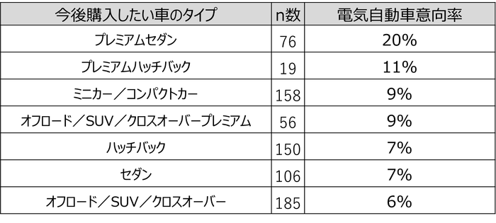 意向する車のタイプ別でみると、電気自動車を意向する人の割合は、プレミアムセダンの意向者において最も高く、プレミアムハッチバック意向者が続き、高級車を求める人において電気自動車に対する意向が高いことが分かった。一方、オフロード/SUV/クロスオーバータイプの購入意向者は比較的電気自動車の意向率が低めであった。