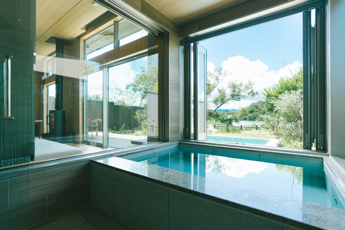 温泉半露天風呂、ガーデンテラス、また屋外プールや薪ストーブと、大人の旅に欠かせないものを揃えました。