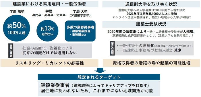 建設業では、常用雇用・一般労働者のうち高卒が全体の約50%を占め、人数にして100万人超、専門学校卒・高等専門学校卒・短大卒も全体の13%程度、約29万人とされます※2。大卒でも営業担当、事務職など建築士以外の業務従事者が多数存在し、建築学部での学び直し需要は高いと考えられます。さらに、一級建築士の社会的責任は時代とともに増加していますが、建築士事務所に所属する一級建築士の約65%は50代以上と高齢化※3 し、一級建築士事務所の登録人数も減少しており※4、新規資格取得者の需要が高まっています。