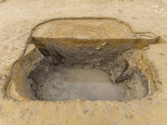 最下層には木片を中心とした有機物を敷き込み、その上に粘土を積んで埋め、さらにこれをもう一度掘り起こして再び最下層に栗皮・木の葉を主体とする有機物を敷き込み、粒度をあえて不均一に調整した土を積み、さらにこの土を掘り起こして砂層と粘土層を交互に積んで埋めています。非常に入念な埋め方をしており、当該地点を再利用するために地盤沈下が起きないよう十分な埋め戻しを行ったと考えられます。