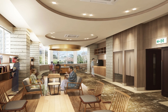 片方の内湯の一部は半露天風呂にリノベーションし、もう片方の露天風呂は格子を一新するなど、今までよりも開放感のある空間で温泉をお楽しみいただけます。また、洗い場に仕切りを設けるなど、使い勝手の良さにも配慮いたしました。伊香保の名湯を楽しんだ後は、大屋根をモチーフにしたデザインの和情緒あふれる湯上りラウンジでゆっくりと喉をうるおしてください。