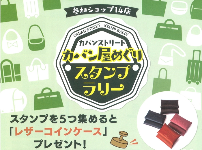 周辺の参加店を巡り、スタンプを5つ集めていただくと、カバンストリートのロゴ入り「レザーコインケース」をプレゼント致します。(参加無料)