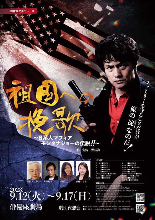 劇団夜想会 野伏翔プロデュース『祖国への挽歌』~日系人マフィア モンタナ・ジョーの伝説!!~が2023年9月12日 (火) ~2023年9月17日 (日)に俳優座劇場(東京都港区六本木4-9-2 )にて上演されます。