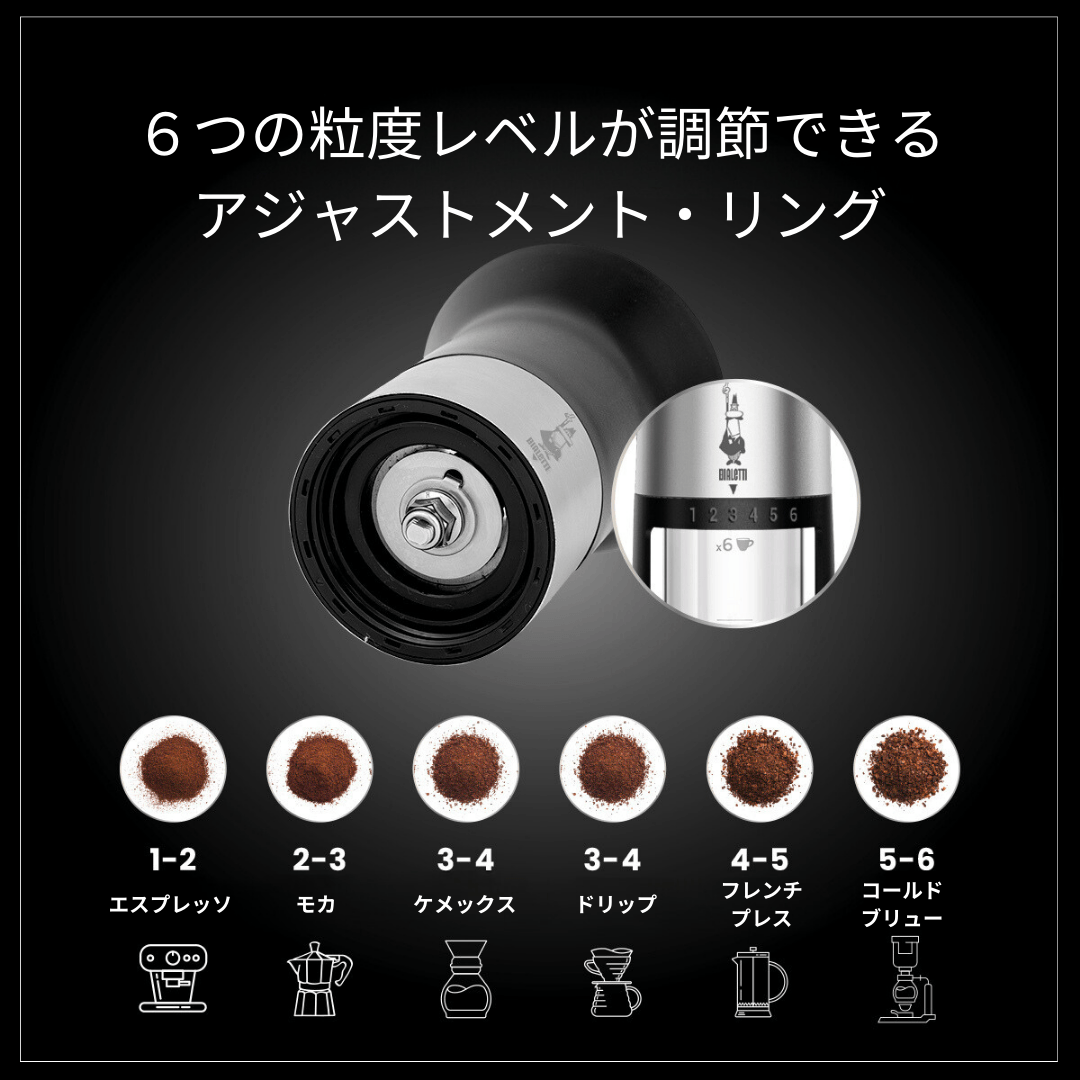 6段階の調節が可能でエスプレッソ、フレンチプレス、ドリップコーヒーなど、それぞれのコーヒーに適した挽き具合をお選びいただけます。