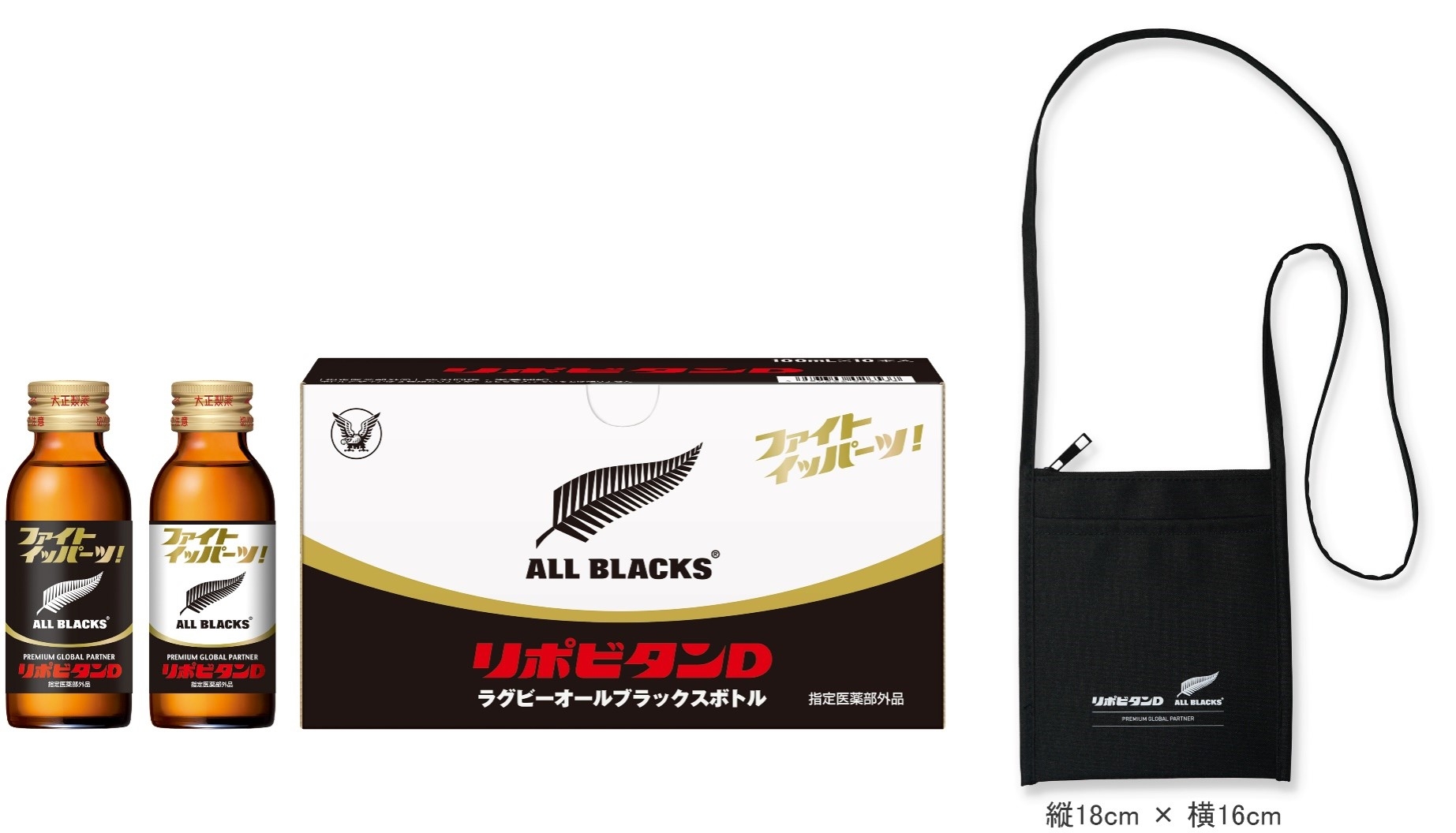 今年も日本とニュージーランド両代表チーム、ラグビー界全体を盛り上げるため、例年好評の「リポビタンD ラグビー日本代表応援ボトル」と「リポビタンD ラグビーオールブラックス応援ボトル」を大正製薬ダイレクト、大正製薬ダイレクト楽天市場店、大正製薬ダイレクトAmazon店で発売いたします。2024年版の日本代表応援ボトルは、日本代表のファーストジャージーとセカンドジャージーをラベル全体にデザインしました。オールブラックス応援ボトルは、ニュージーランド代表のファーストジャージーとセカンドジャージーのカラーをベースに国花のシルバー・ファーンのエンブレムを全面にプリントしたラベルデザインとし、各30本セットを数量限定でご用意しています。また、ノベルティとして「リポビタンD ラグビー日本代表応援ボトル」には、桜のエンブレムとリポビタンDロゴ入りの白のサコッシュ、「リポビタンD ラグビーオールブラックス応援ボトル」には、シルバー・ファーンのエンブレム入りの黒のサコッシュが付いています。