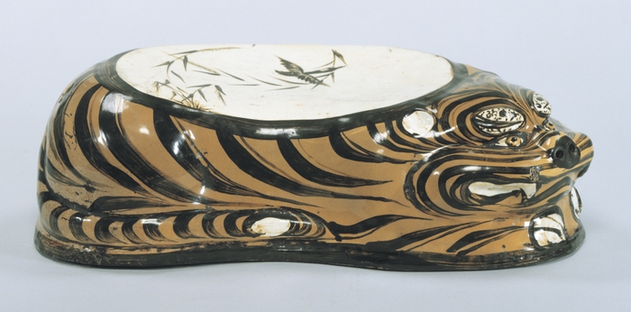 虎の体は素地に白化粧を施し、褐釉と鉄絵で表しています。魔よけの願いがこめられた陶製の枕です