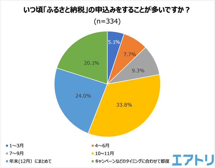 「ふるさと納税」の申込み時期は「10〜11月」が最多で33.8%となりました。次いで「年末(12月)にまとめて」が24%でした。
