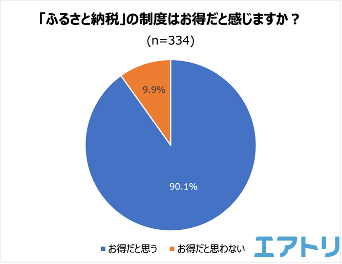 「ふるさと納税」の制度は「お得だと思っている」人が90.1%、「お得だと思わない」人は9.9%でした。