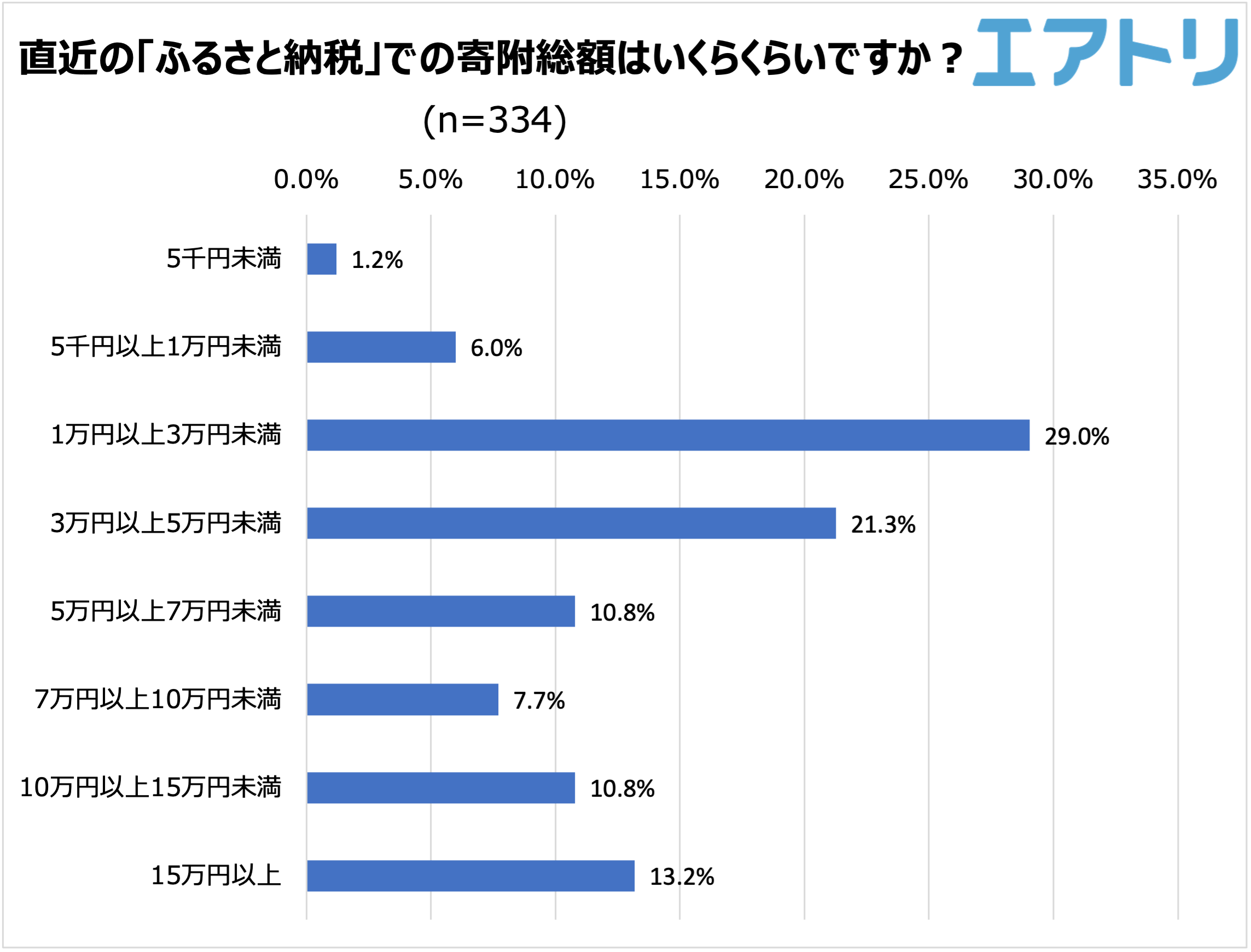 「ふるさと納税」の寄附総額は「1万円以上3万円未満」が最多で29%、次いで「3万円以上5万円未満」が21.3%、「15万円以上」が13.2%となりました。