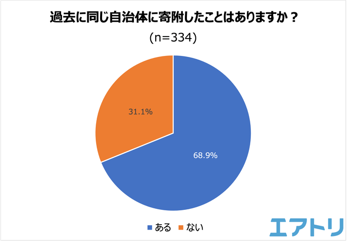 同じ自治体に寄附したことが「ある」人は68.9%とおよそ7割。