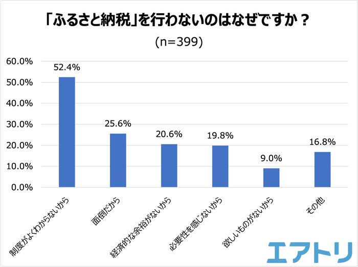 「ふるさと納税」をしない理由として、「制度がよくわからないから(52.4%)」、「面倒だから(25.6%)」、「経済的な余裕がないから(20.6%)」と続きました。