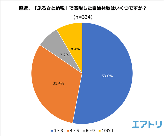 「ふるさと納税」で寄附した自治体数は「1〜3」と回答した人が最も多く半数を超えて53%となりました。ついで「4〜5」が31.4%となり、5自治体以内で合わせて84.4%となりました。